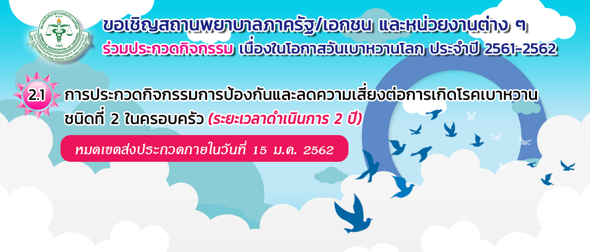โครงการประกวดกิจกรรมวันเบาหวานโลกประจำปี 2561-2562          เนื่องด้วยปี 2561 นี้ สมาพันธ์เบาหวานโลก (IDF) ได้กำหนดหัวข้อรณรงค์วัน�...