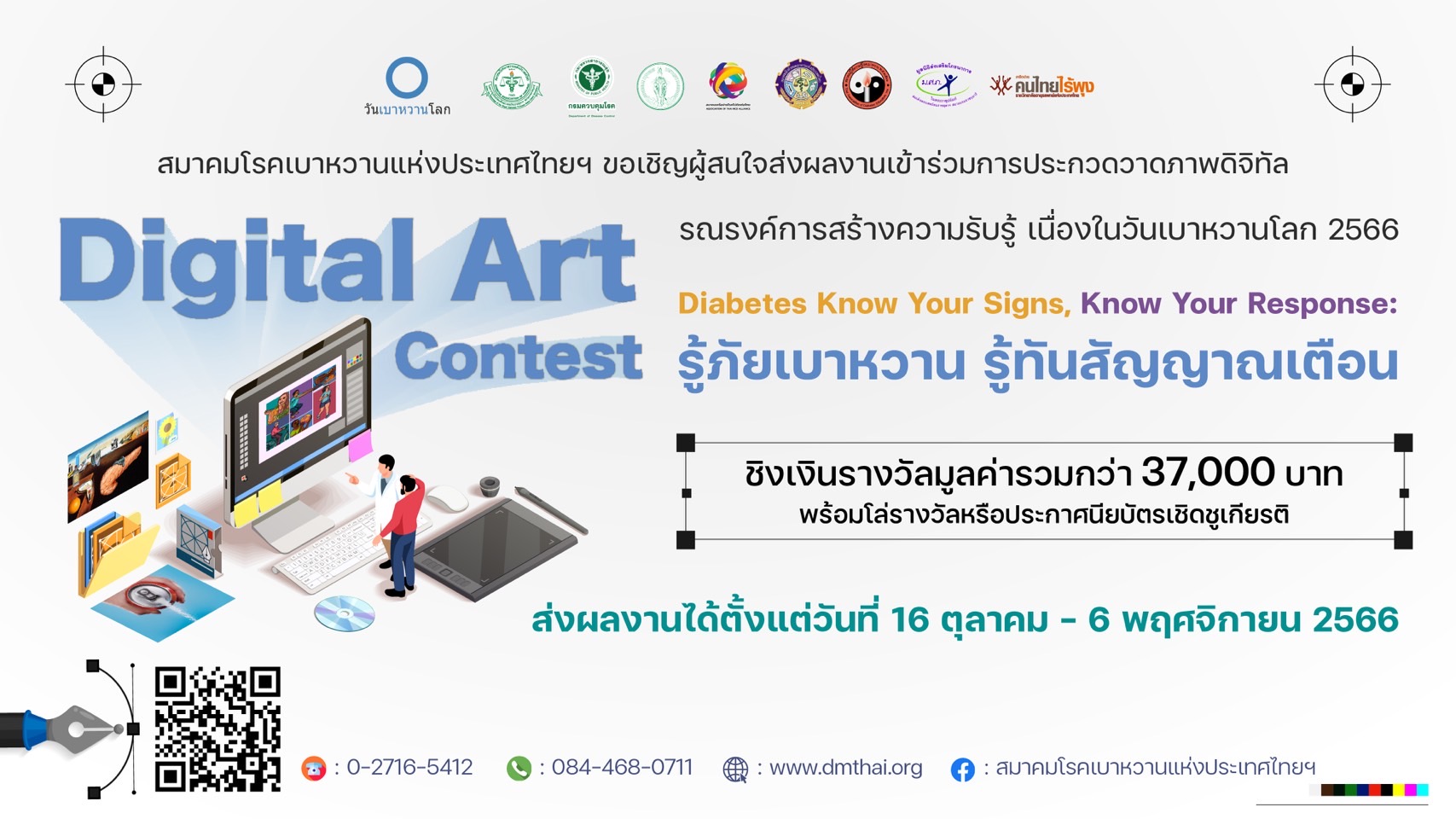 ขอเชิญส่งผลงานเข้าร่วมประกวดวาดภาพดิจิทัล (Digital Art) รณรงค์การสร้างความรับรู้ เนื่องในวันเบาหวานโลก 2566 หัวข้อ "Diabetes Know Your Signs, Know Your Response: รู้ภัยเบาหวาน รู้ทันสัญญาณเตือน"