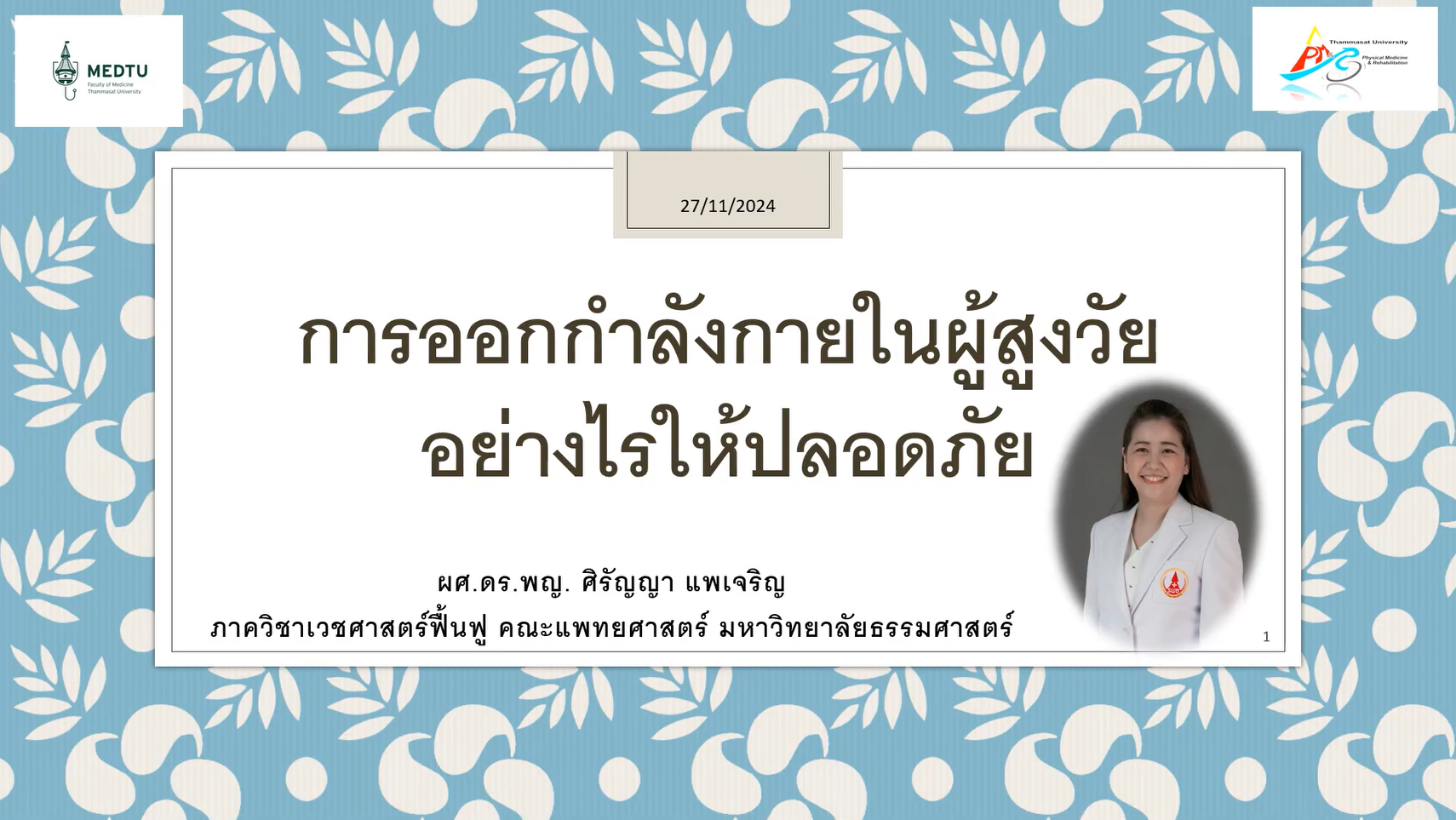 การออกกำลังกายในผู้สูงวัย อย่างไรให้ปลอดภัย คลิปจากเบาหวานสัญจรออนไลน์ EP.28 โดย ผศ.ดร.พญ.ศิรัญญา แพเจริญ คลิกที่ภาพเพ�...