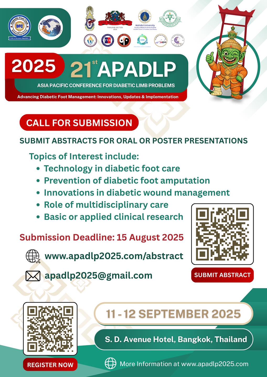 Call for abstract : ส่งก่อน 15 สิงหาคม 2568 นะคะ http://www.apadlp2025.com/abstract.htmlการประชุมวิชาการ 21st APADLP (Asia Pacific Conference for Diabetic Limb Problems)ภายใต้หัวข้อ "Advancing Diabetic Foot Management: Innovations, Updat...