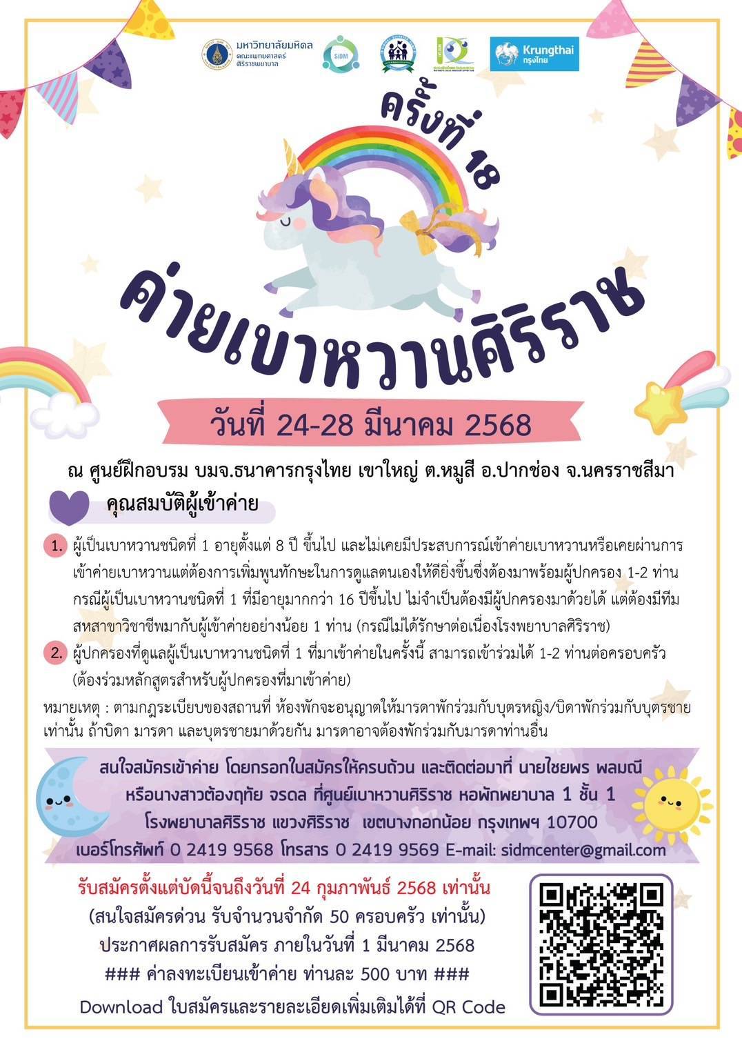 ขอเชิญเข้าร่วม ค่ายเบาหวานศิริราช ครั้งที่ 18 วันที่ 24-28 มีนาคม 2568