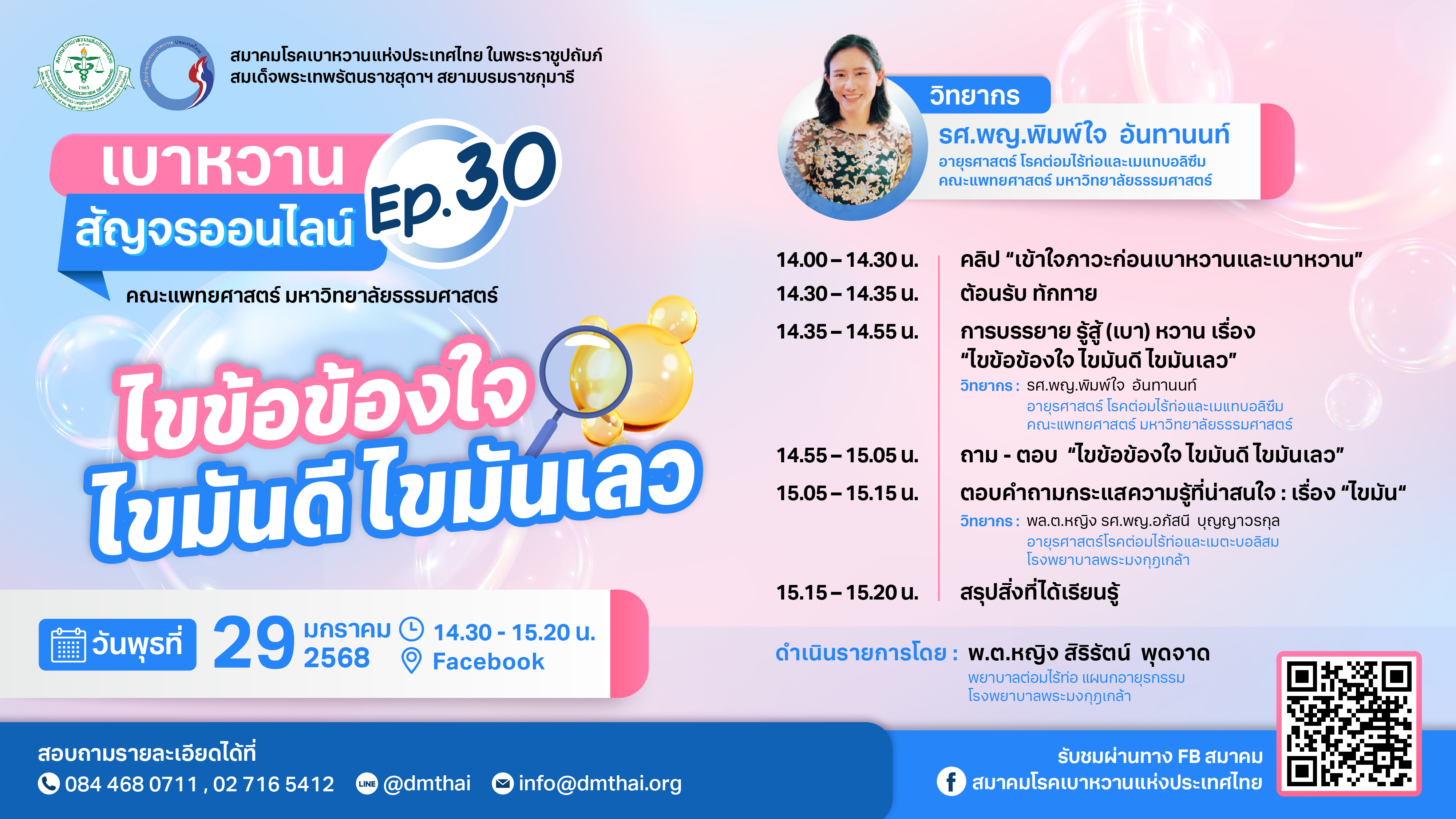 เบาหวานสัญจรออนไลน์ Ep.30 หัวข้อ "ไขข้อข้องใจ ไขมันดี ไขมันเลว"