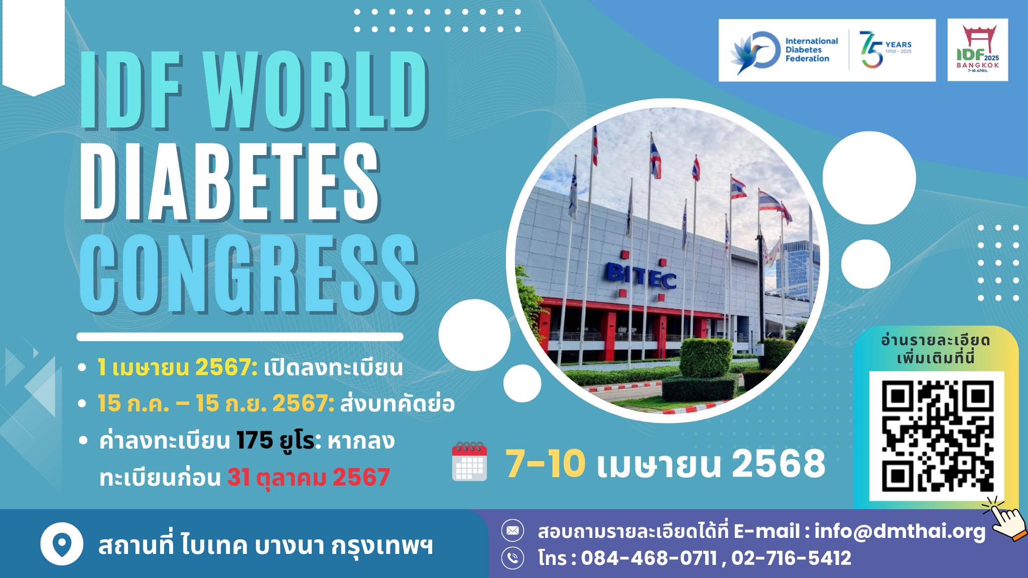 กำหนดการ งานประชุม IDF ประเทศไทย 2568เปิดลงทะเบียน 1 เมษายน ถึง 31 ตุลาคม 2567   https://idf2025.org/registration/ ส่งบทคัดย่อ 15 กรกฎาคม ถึง 15 กันยายน 2567 �...