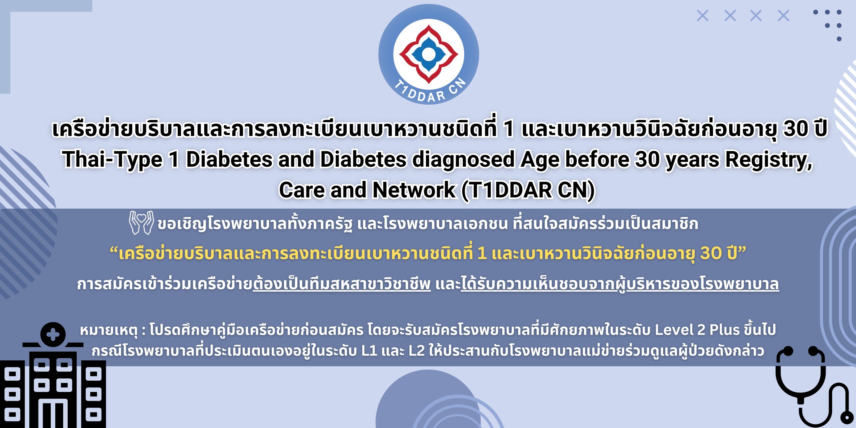 ขอเชิญโรงพยาบาลภาครัฐ และโรงพยาบาลเอกชน ที่สนใจสมัครร่วมเป็นสมาชิก “เครือข่ายบริบาลและการลงทะเบียนเบาหวานชนิดที่ 1 และเบาหวานวินิจฉัยก่อนอายุ 30 ปี”