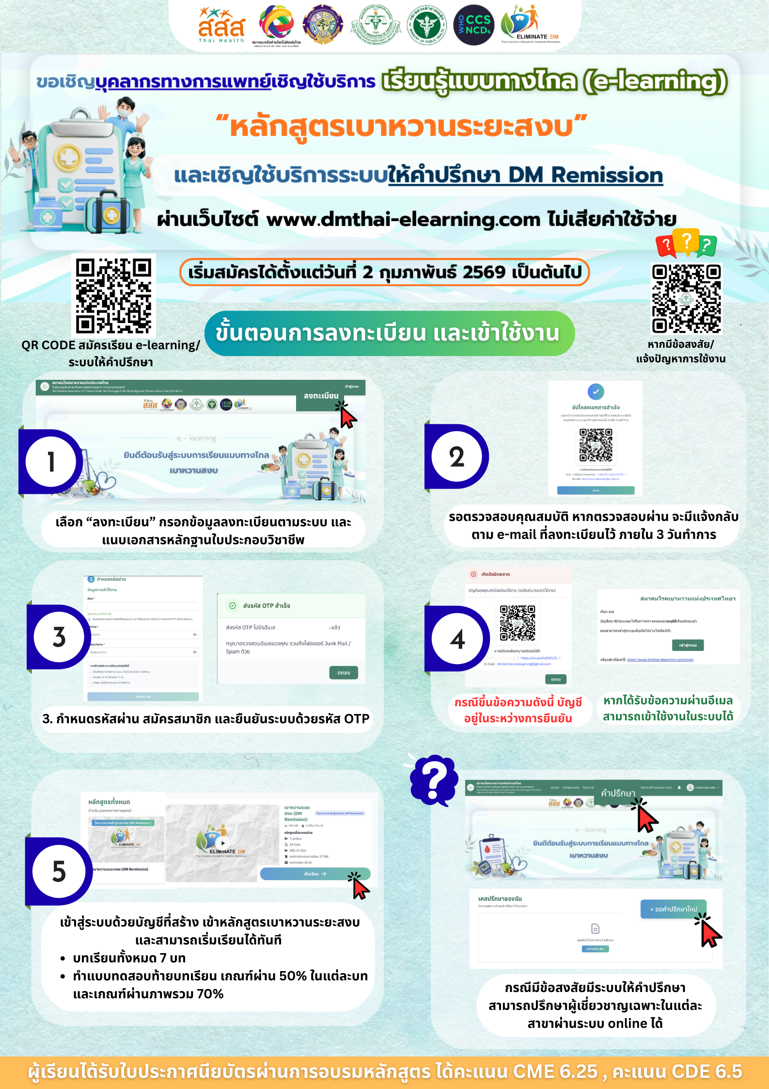 ขอเชิญบุคลากรทางการแพทย์ เรียนรู้แบบทางไกล (e-learning) "หลักสูตรเบาหวานระยะสงบ" และเชิญใช้บริการระบบให้คำปรึกษา DM remission สมัครได้ตั้งแต่ 2 กุมภาพันธ์ 2569 คลิกลงทะเบียน https://www.dmthai-elearning.com